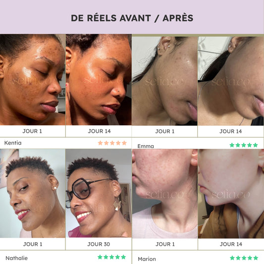 Découvrez les transformations remarquables de nos clientes, en seulement 2 semaines grâce à notre traitement puissant et spécifiquement formulé pour estomper les taches brunes et éliminer l'hyperpigmentation.